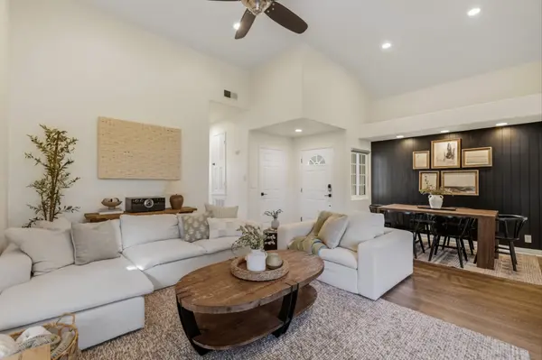 The renovated kitchen features gorgeous countertops and backsplash, ample storage, and a serene breakfast nook surrounded by a slider and windows, providing abundant natural light. Living large, the spacious living and dining areas flow together seamlessly, with a statement fireplace, slider, patio with a view, and soaring ceilings creating an inviting and comfortable space to both relax and entertain. Two bedrooms; two bathrooms, including one with a bathtub; 1,104 ESF; in-unit laundry; storage throughout; and a one-car garage all lend to the home's thoughtful layout, and the primary suite is a true retreat with vaulted ceilings and a spacious, renovated ensuite.